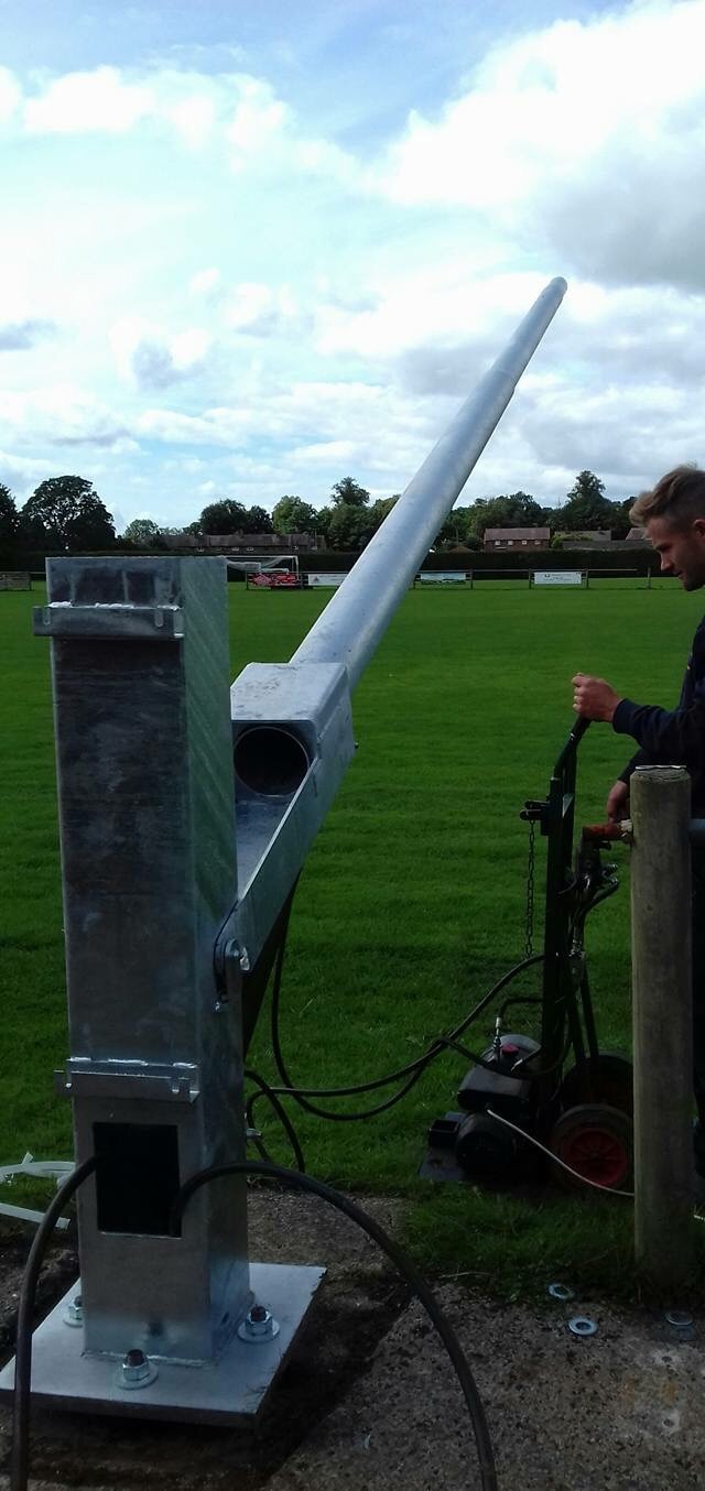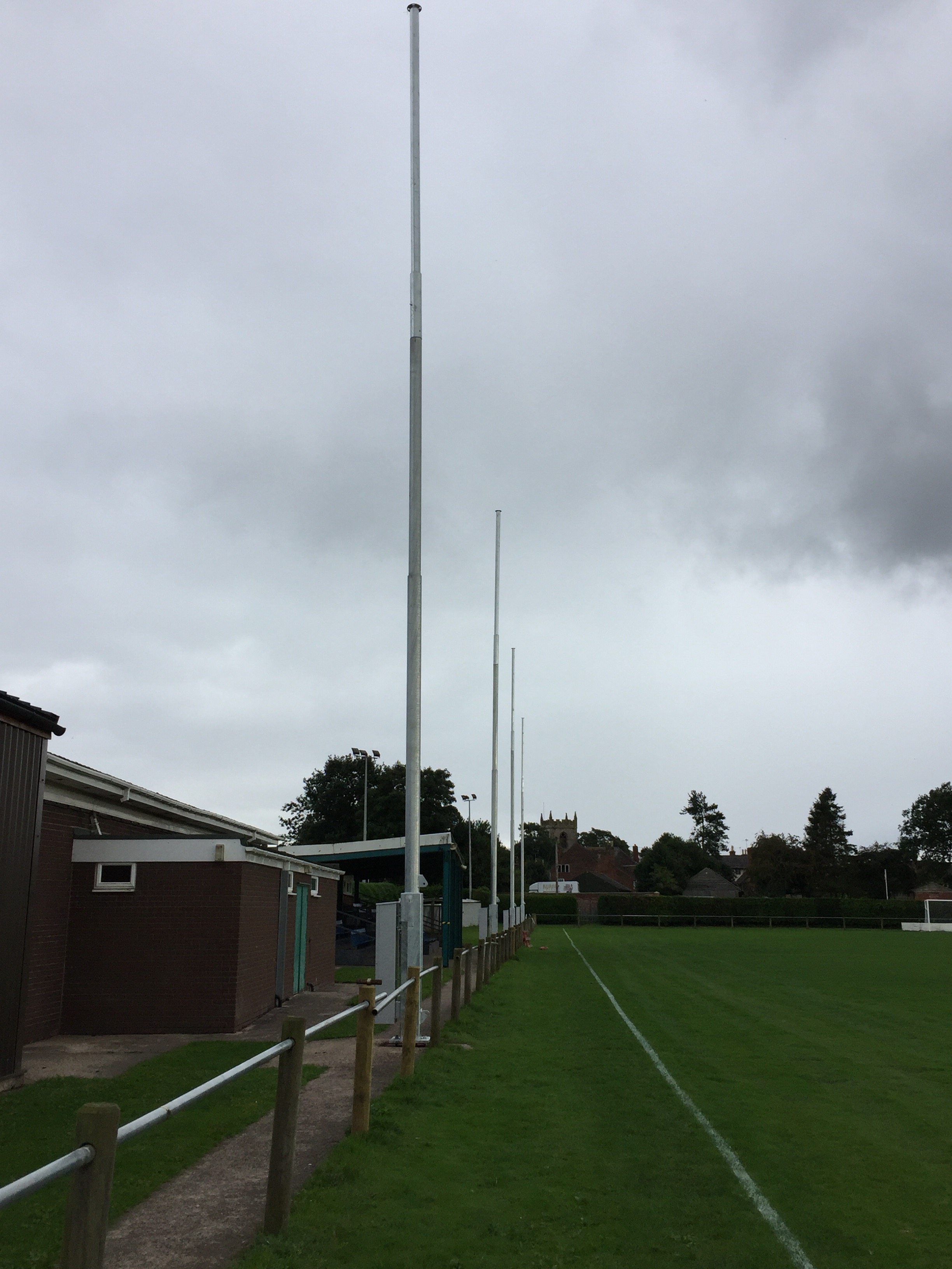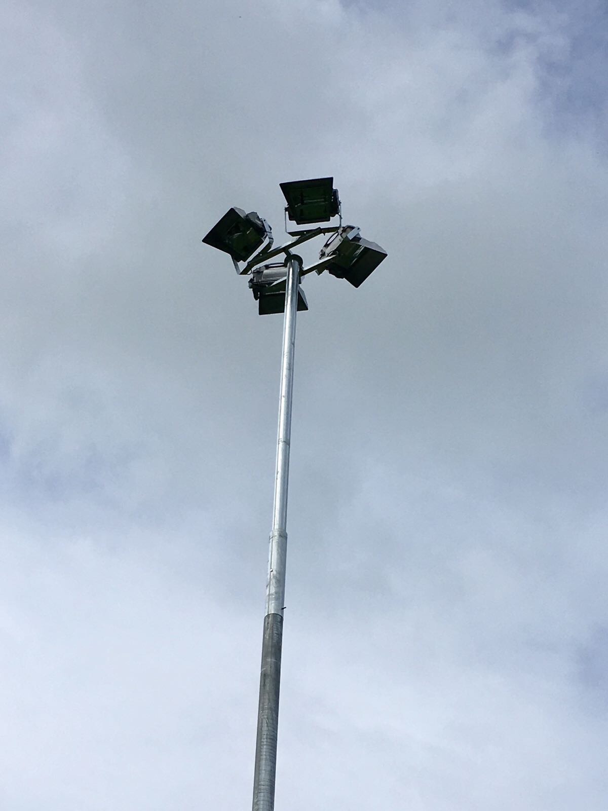 Great 2 days work erecting 8 x 15mt base hinged columns with 16 x 2kw Thorn Champion asymmetric lights. All new switchgear. Also 4 champions to light the training pitch. After tweaking of lights we managed to achieve approx 260 lux. Another job well done by Sports Lighting. A big thank you to the grounds man John, for making our time on site run smoothly. I know he had a few nervous moments when we were craining and erecting the columns. Final pictures of the finished job will be shown tomorrow