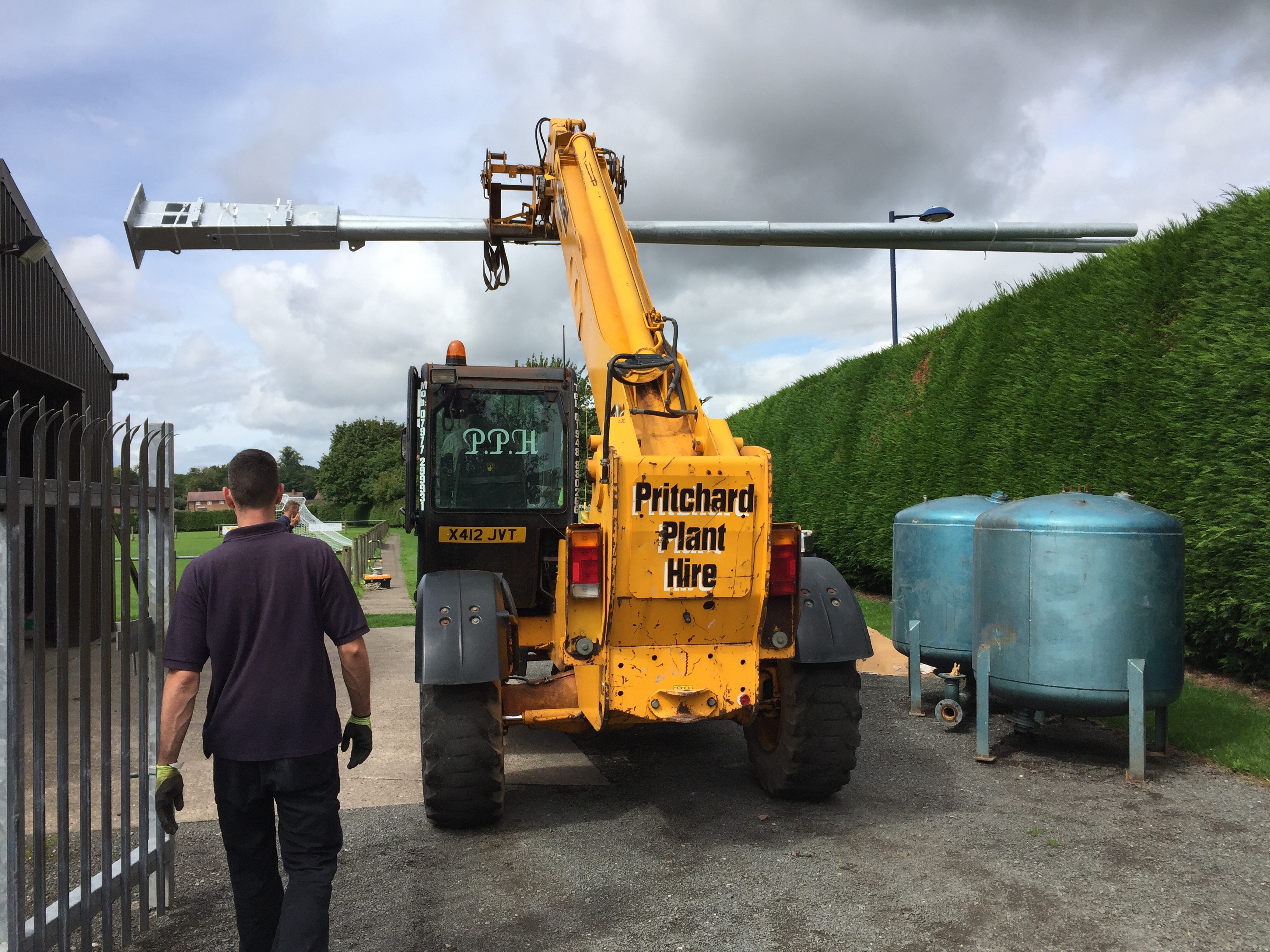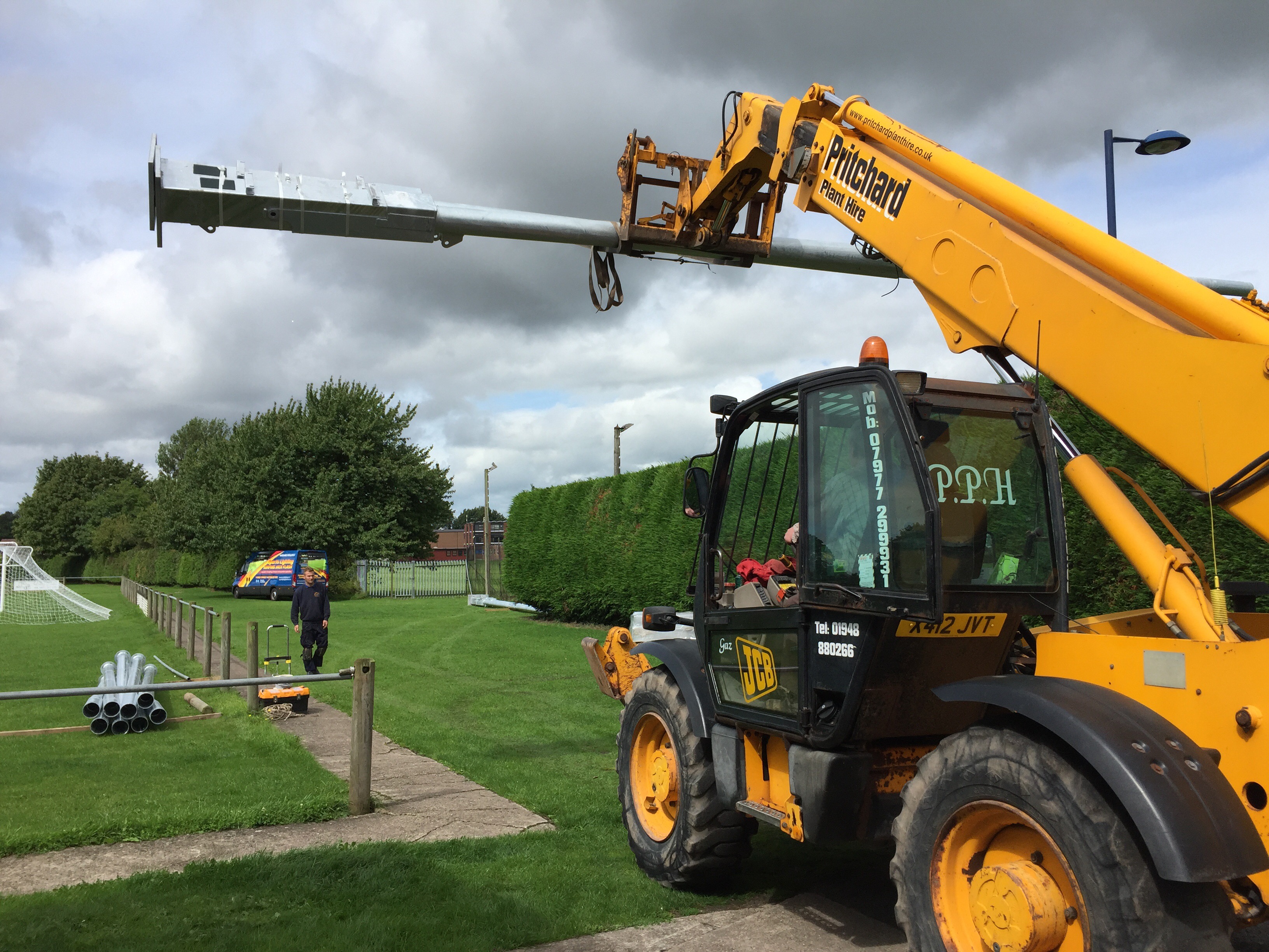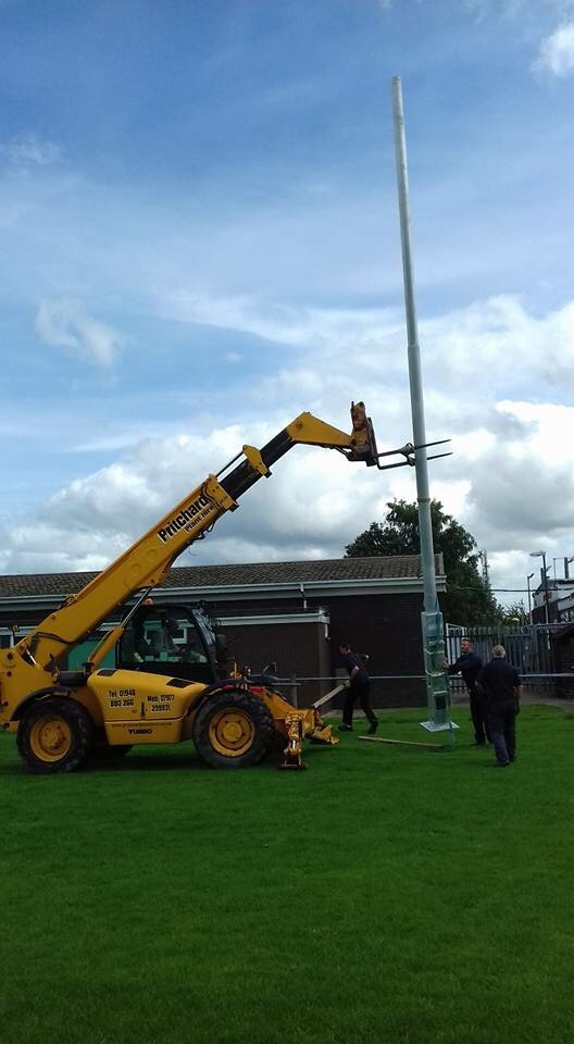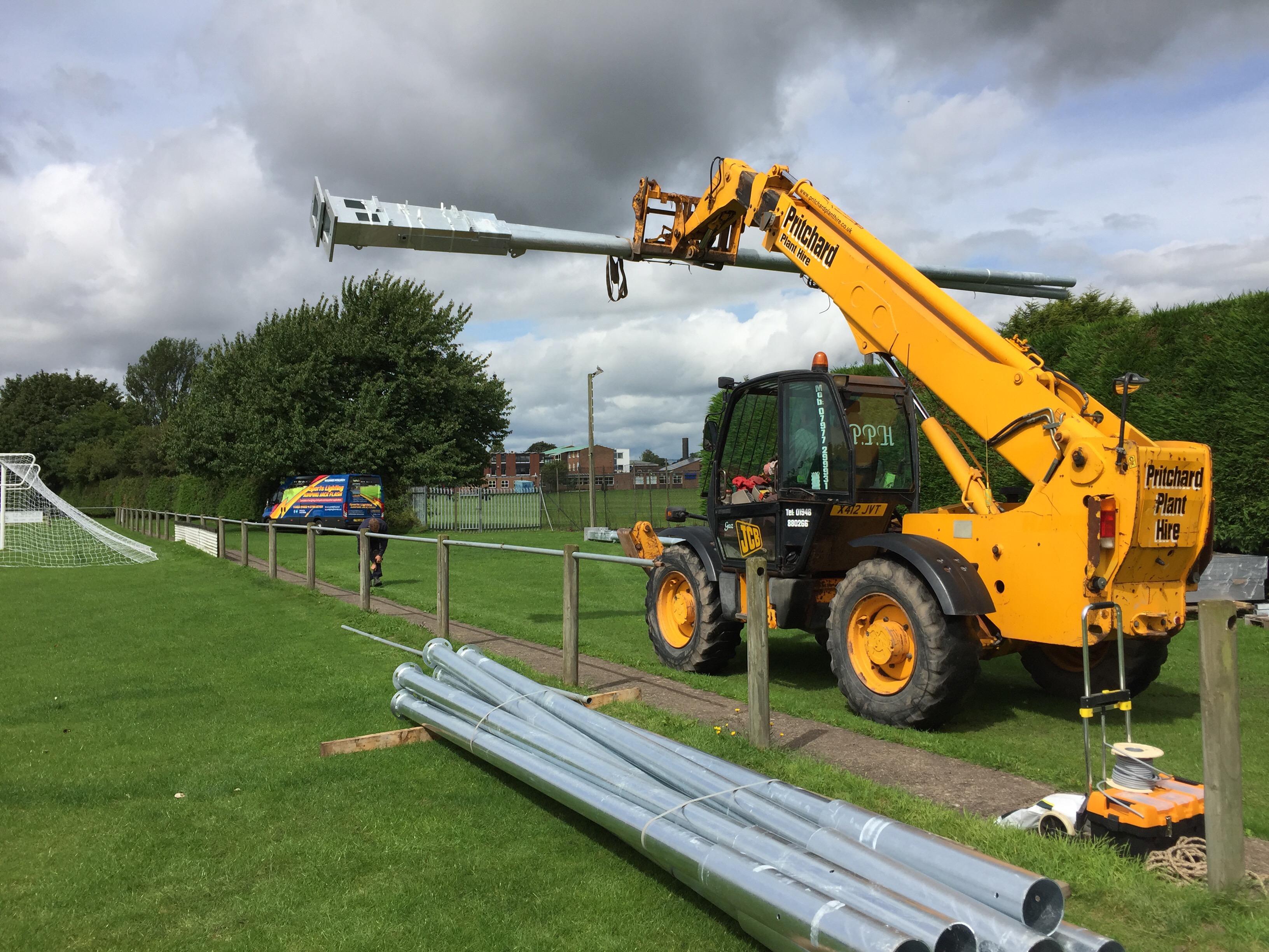 Great 2 days work erecting 8 x 15mt base hinged columns with 16 x 2kw Thorn Champion asymmetric lights. All new switchgear. Also 4 champions to light the training pitch. After tweaking of lights we managed to achieve approx 260 lux. Another job well done by Sports Lighting. A big thank you to the grounds man John, for making our time on site run smoothly. I know he had a few nervous moments when we were craining and erecting the columns. Final pictures of the finished job will be shown tomorrow