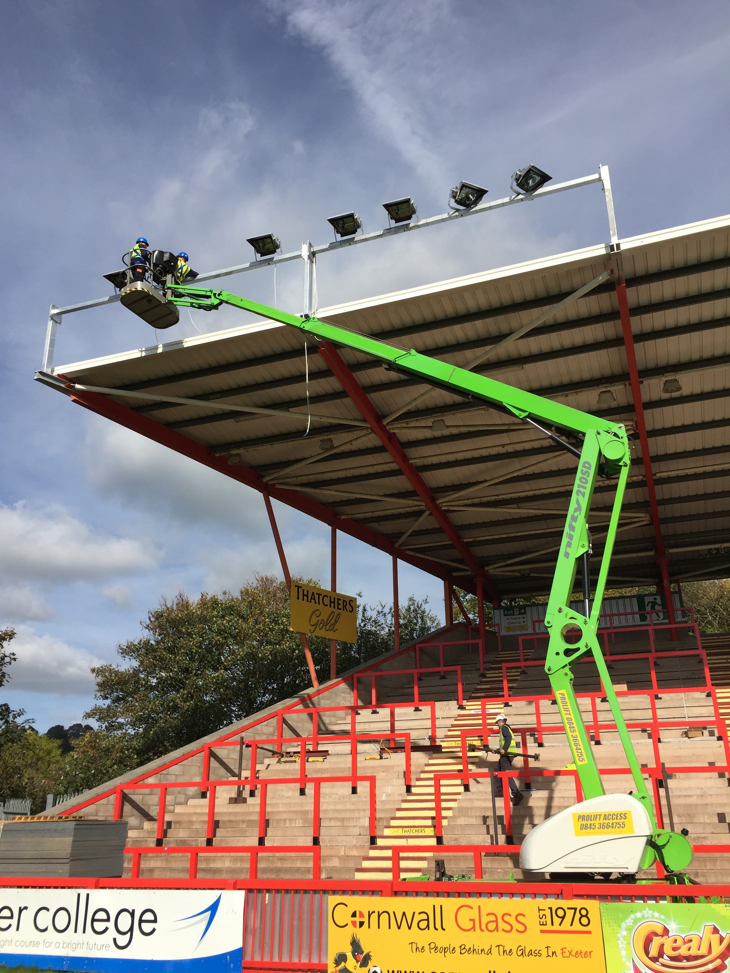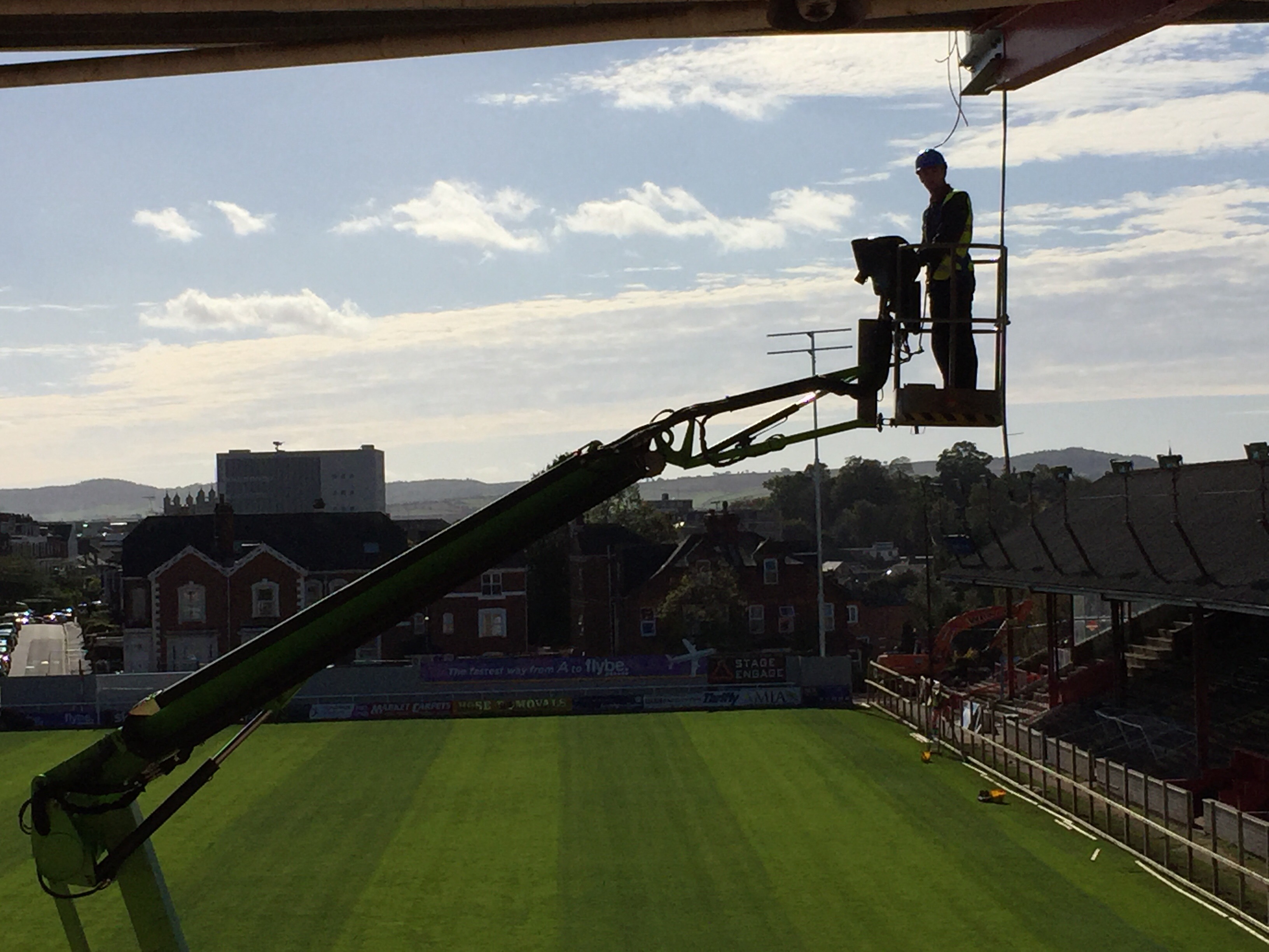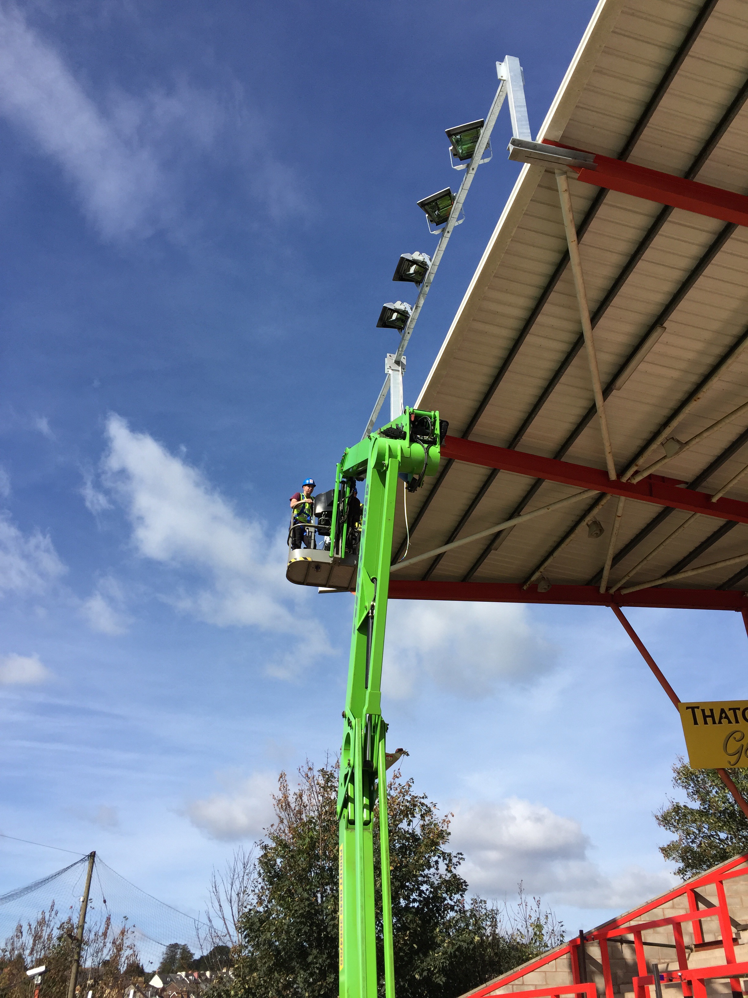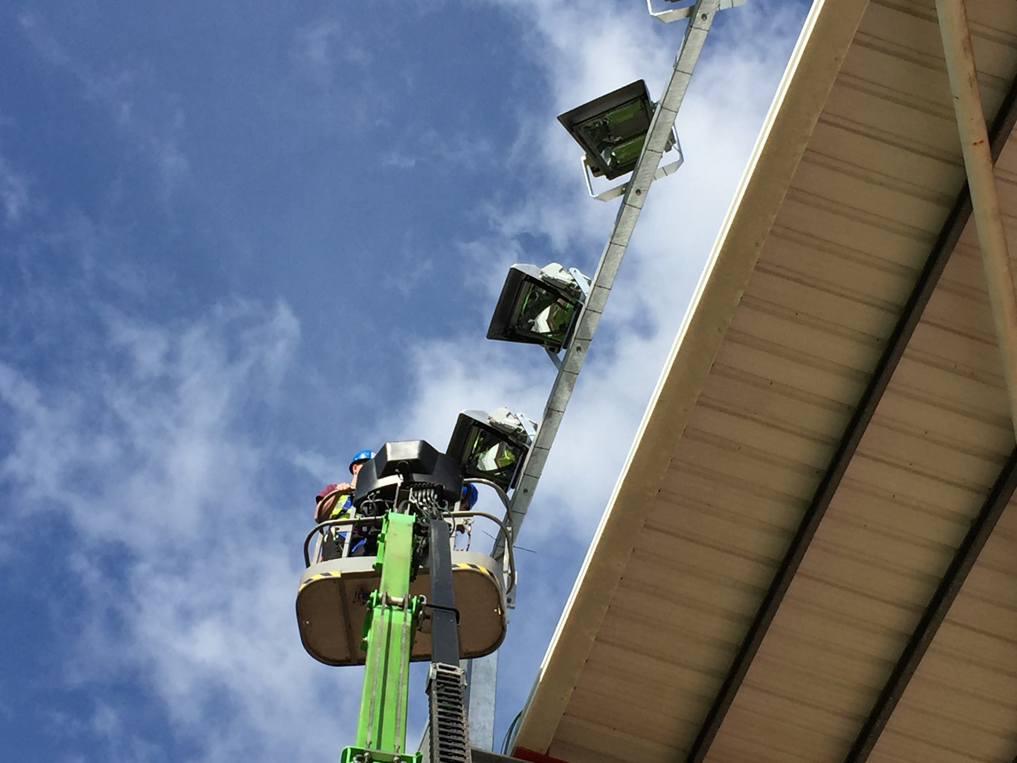 8 x 2kw asymmetric lights fitted to the Big Bank stand. These will be a permanent fixture. Old stand coming down in the next couple of weeks and we then fit 10 projection beam lights on an 18mt temporary column in the corner of the away end until the new stand is built. This will be for approx 12 months
