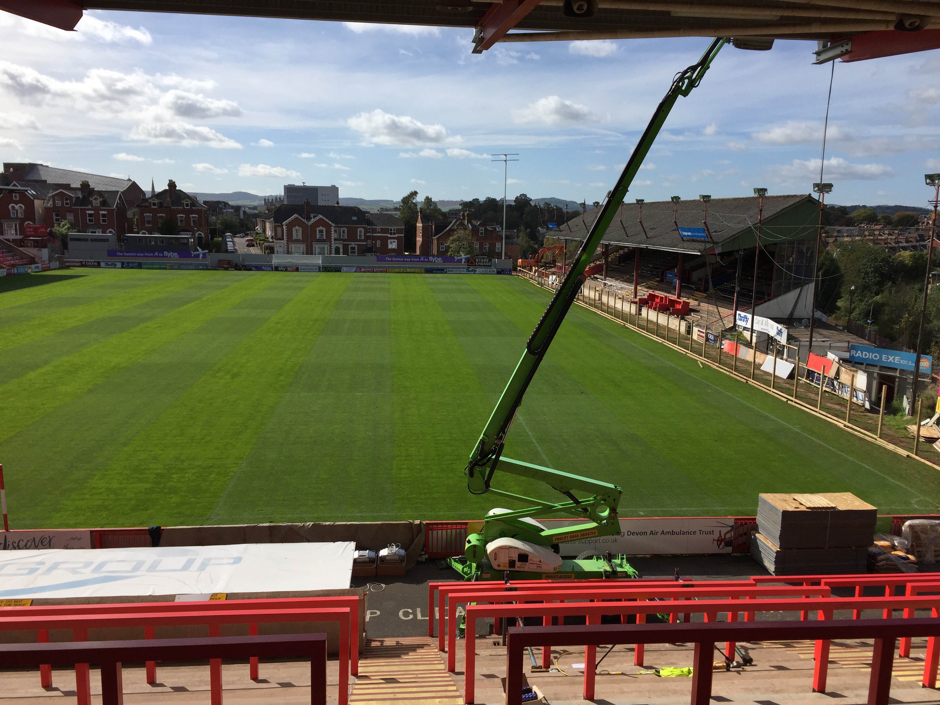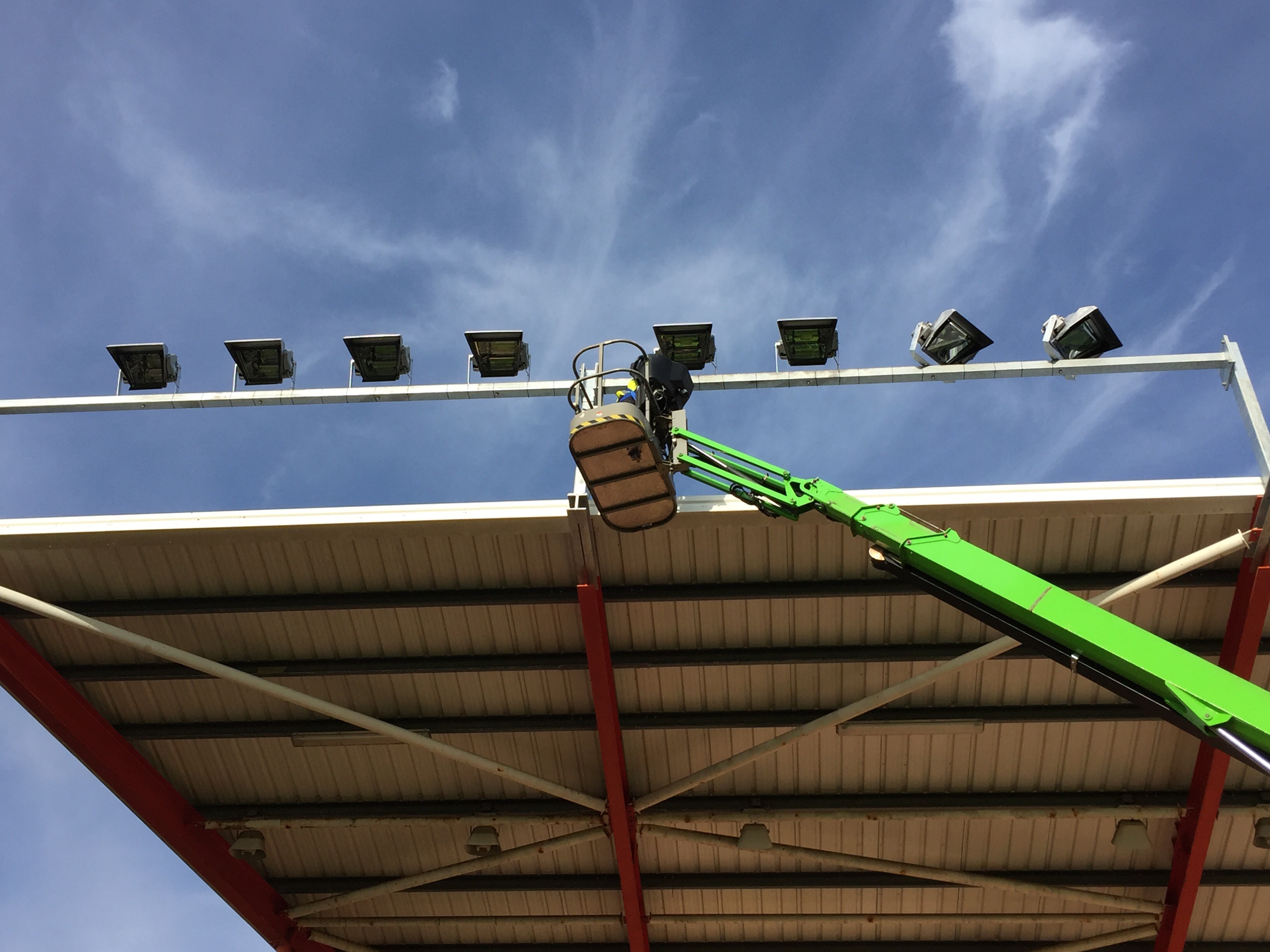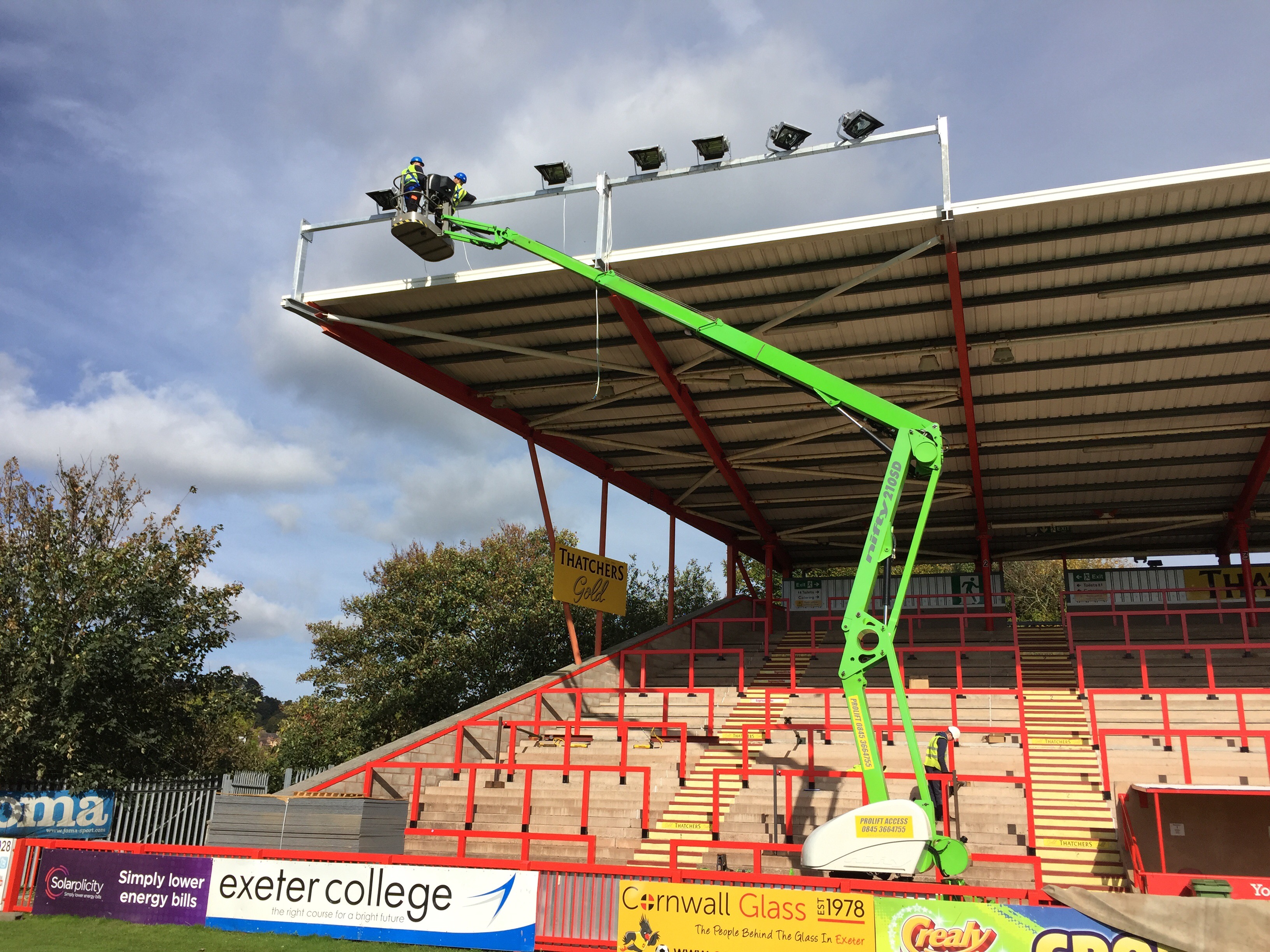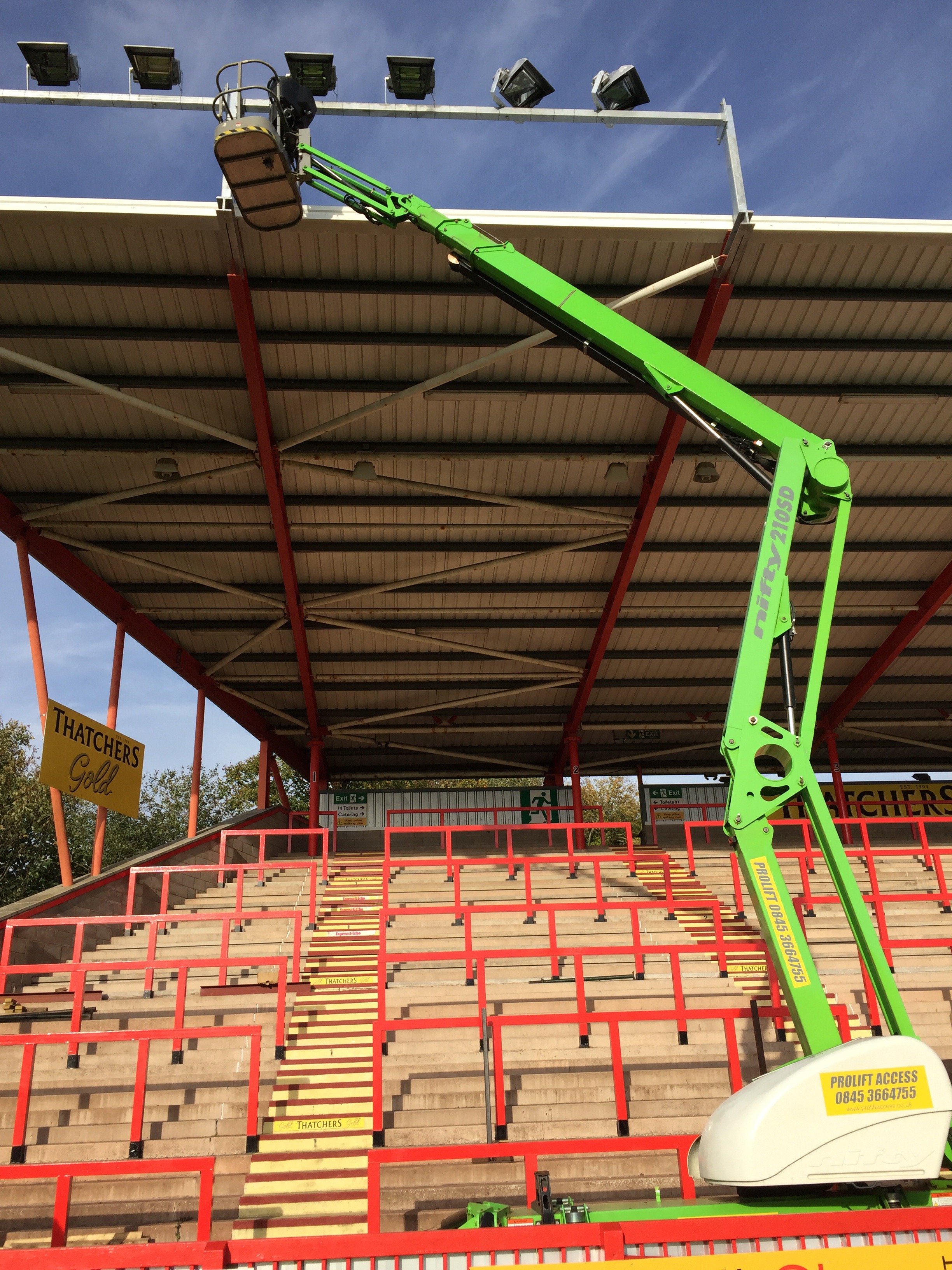 8 x 2kw asymmetric lights fitted to the Big Bank stand. These will be a permanent fixture. Old stand coming down in the next couple of weeks and we then fit 10 projection beam lights on an 18mt temporary column in the corner of the away end until the new stand is built. This will be for approx 12 months