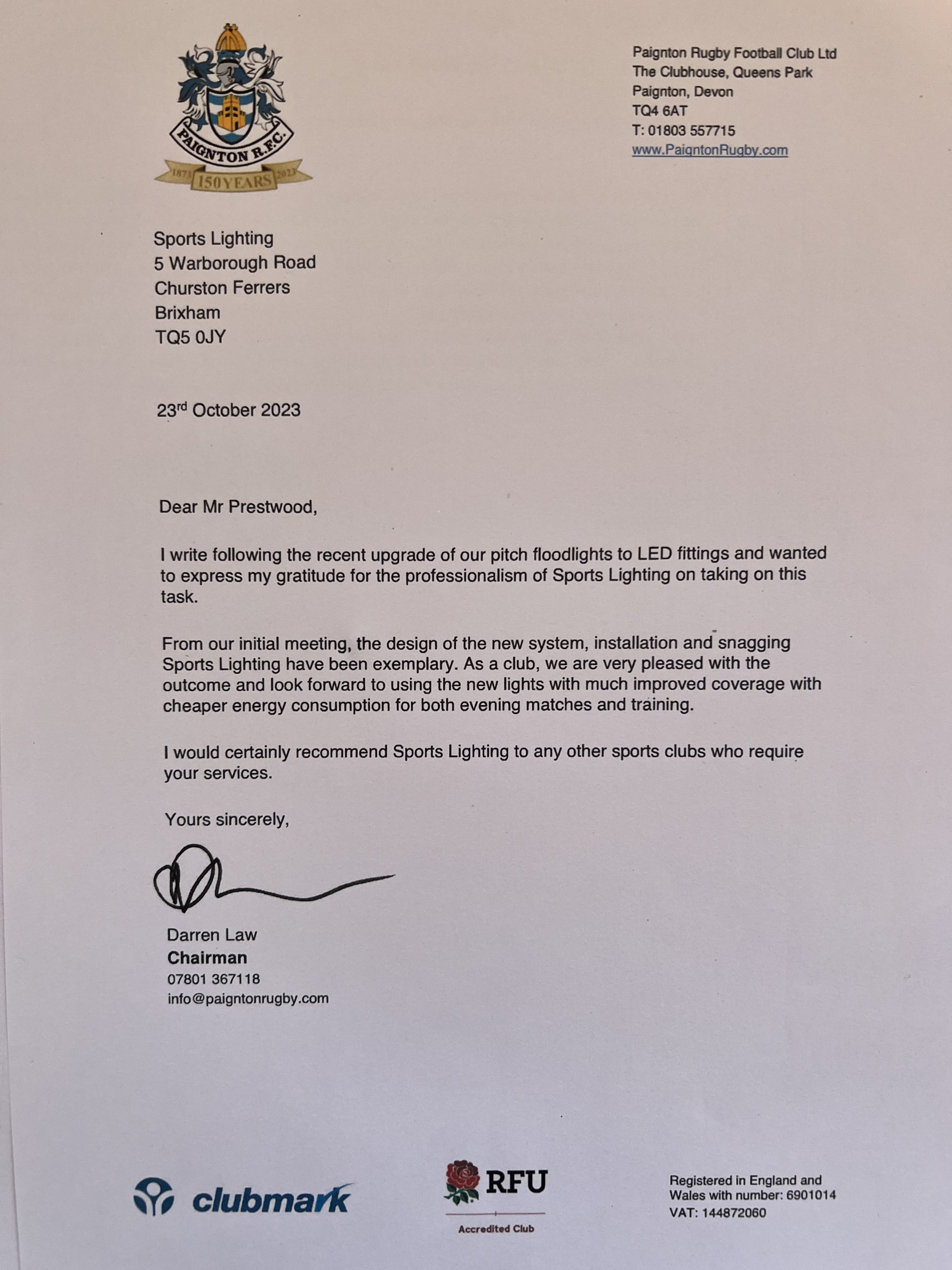 Paignton Rugby Club Kim Prestwood 27th October 2023 Rugby Another great Testimonial. We must be doing something right. Sports Lighting always doing what we do best !! Share on FacebookTweetFollow usShare this: Share on Facebook (Opens in new window) Facebook Share on X (Opens in new window) X Share on Pinterest (Opens in new window) Pinterest Share on LinkedIn (Opens in new window) LinkedIn Print (Opens in new window) Print More Share on Tumblr (Opens in new window) Tumblr Share on Pocket (Opens in new window) Pocket Share on Reddit (Opens in new window) Reddit Related