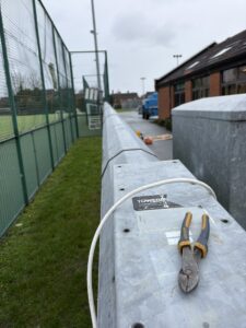 On one side of the 3g it was grass and 2 of the columns could not be brought down, as they were to near the fence. We had to use a Cherry Picker, but first we had to get to the 3g pitch with the Cherry Picker, which was across 200mts of grass and 100mts to the end of the pitch. We had to drag our 8ft x 4ft mats back to front, back to front etc etc. 300mts to get to the end of the pitch, and 300mts to get out. We were certainly ready for our evening meal and accommodation.