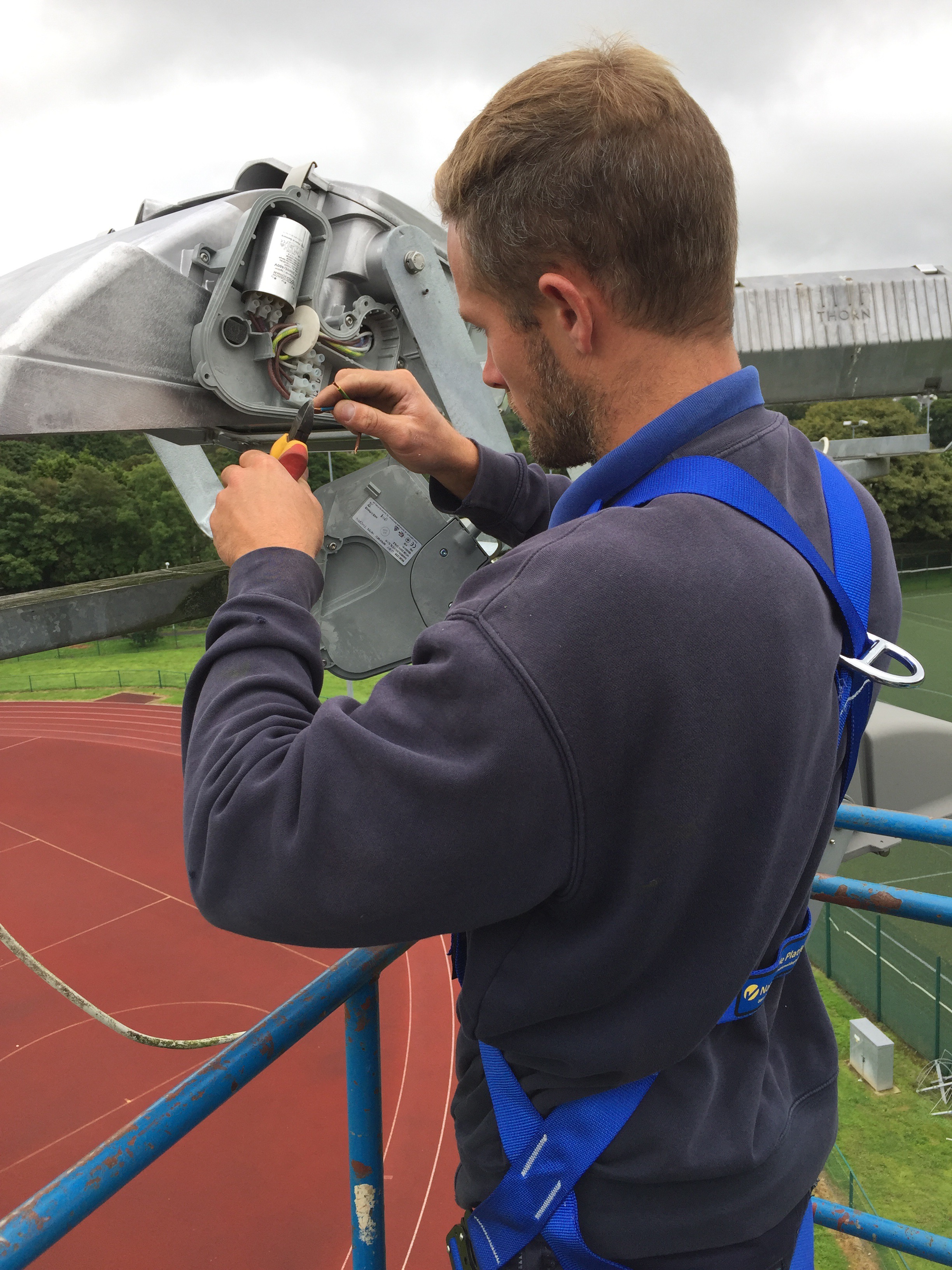 Complete refit of all new heads. Static columns, so had to use a little cherry picker !!. Tavistock College have a large running track and a 3G pitch. All old lights have corroded over the years. So have to change approx 40 new 2kw metal halide asymmetric lights. Nothing is to much for Sports Lighting. Floodlighting is our forti.