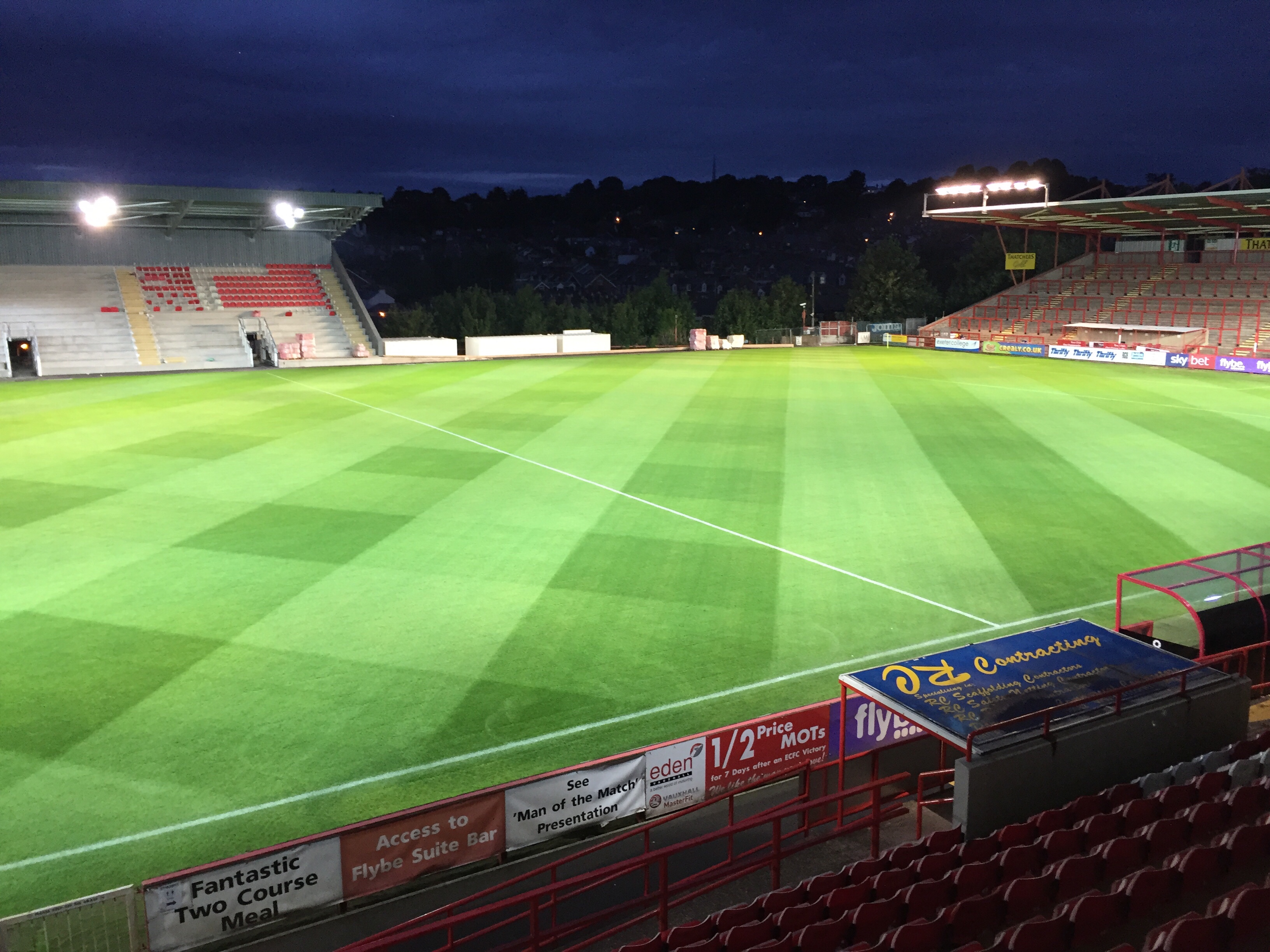 Just completed the installation of the lights back onto the new stand. Angled to perfection thus giving a lux level of 650lx. Well pleased with the outcome. Uniformity is very good. Only draw back had to do the lux level test, recording 88 points at 21.00pm and took a couple of hours. Late night but come away happy. Another great installation by Sports Lighting.